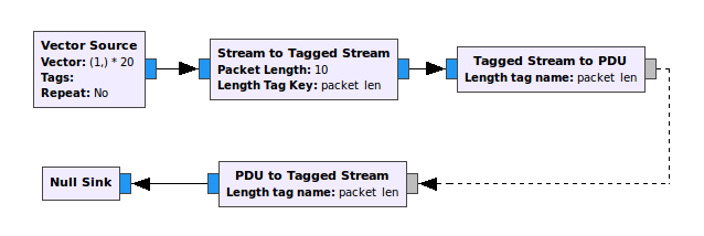 The vector source outputs 20 complex samples, which are subsequently split in two PDUs á 10 samples, converted back to a stream, and dropped. For me it was unexpected that this, rather simple flow graph, cannot be shut down. The problem is the PDU to Tagged Stream block, which ignores the done message. It could only be terminated through the stream port, which is, however, not possible in this scenario.